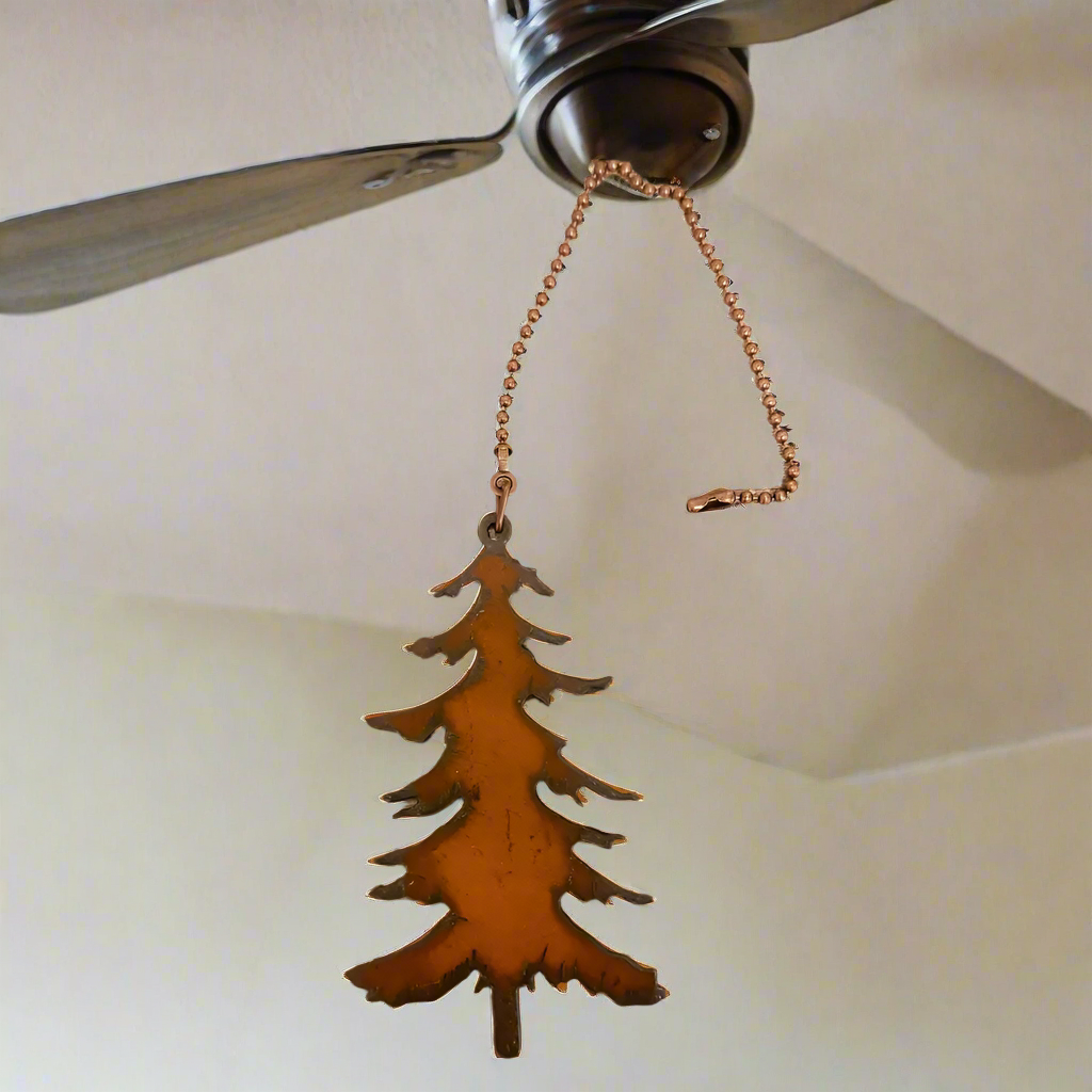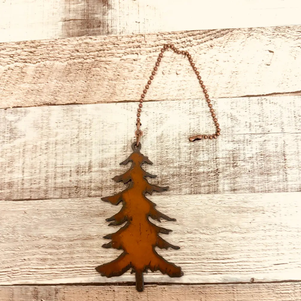 From the esteemed Rusty Cowgirls comes the Emporium Pine Tree Lodge Rustic Ceiling Fan Pull, a unique addition to your home decor. This sculptural piece, perfect for year-round use, combines functionality with a touch of rustic charm. Each metal piece is individually rusted in our Arizona rust farm, ensuring an authentic, distinct finish. Whether you're enhancing a large space or adding a custom touch to a small room, this fan pull promises to be a conversation starter. American made, and cut by Americans, it represents our commitment to quality and craftsmanship.