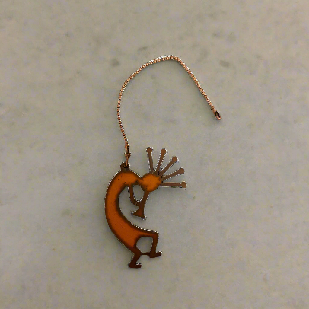 From the esteemed Rusty Cowgirls comes the Kokopelli Native Flute Southwest Rustic Ceiling Fan Pull, a unique addition to your home decor. This sculptural piece, perfect for year-round use, combines functionality with a touch of rustic charm. Each metal piece is individually rusted in our Arizona rust farm, ensuring an authentic, distinct finish. Whether you're enhancing a large space or adding a custom touch to a small room, this fan pull promises to be a conversation starter. American made, and cut by Americans, it represents our commitment to quality and craftsmanship.